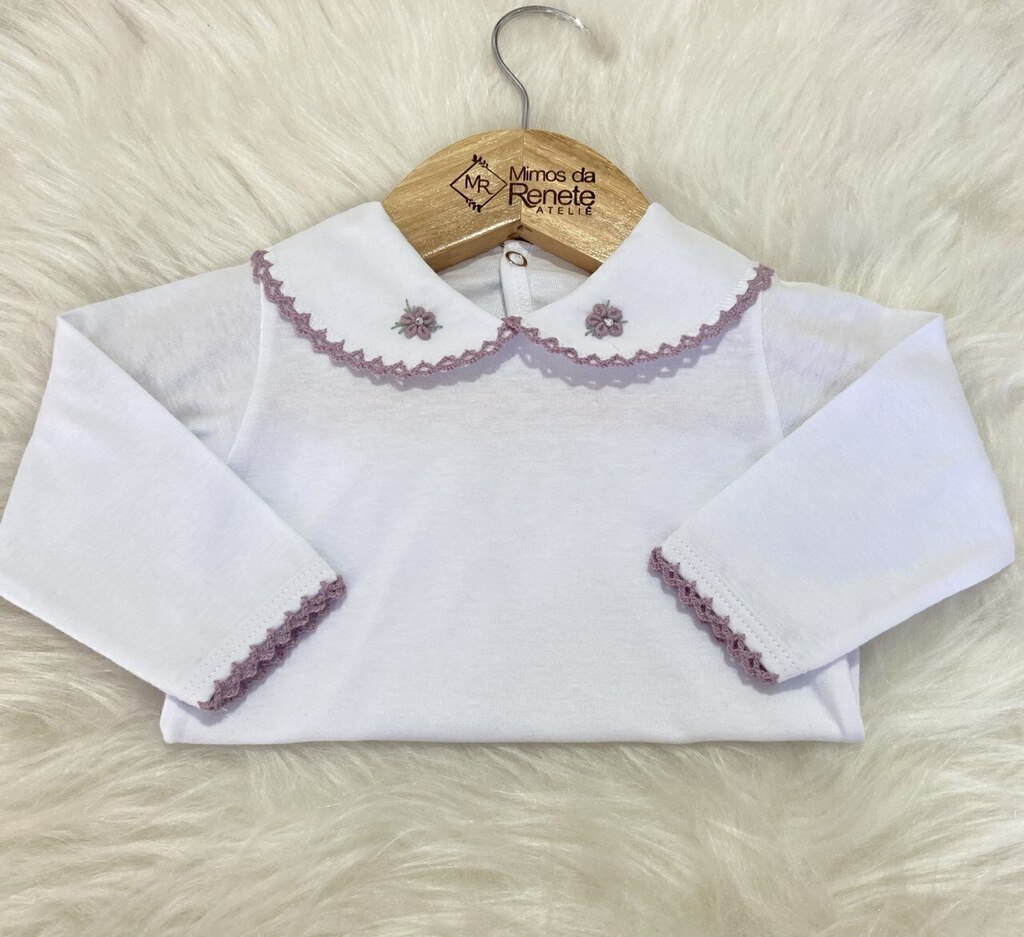 - 01 body de manga longa em tecido 100% algodão, gola com flor bordada em crochê e acabamento em picueta (crochê) na gola e punhos.