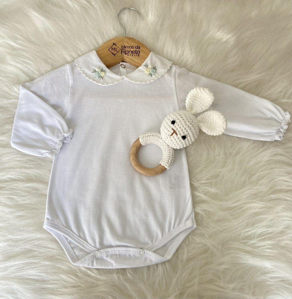 - 01 body de manga longa em tecido 100% algodão, gola com bordado em rococó e acabamento de picueta (crochê) na gola e punhos.